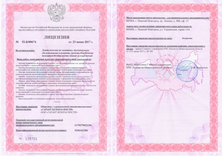 ЛИЦЕНЗИЯ НА ОСУЩЕСТВЛЕНИЕ ДЕЯТЕЛЬНОСТИ ПО МОНТАЖУ, ТЕХНИЧЕСКОМУ ОБСЛУЖИВАНИЮ И РЕМОНТУ СРЕДСТВ ОБЕСПЕЧЕНИЯ ПОЖАРНОЙ БЕЗОПАСНОСТИ ЗДАНИЙ И СООРУЖЕНИЙ от 23.06.2017 г. № 52-Б/00674